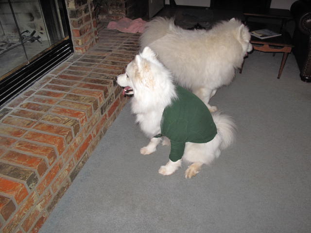 While Husband was out of town, a fairly fierce storm blew up with hail, lightening and high winds. Pearl freaks out fairly easily at loud noises and even Evelyn pressed close and showed some alarm. A friend used to wrap her dog in a snug shirt during thunderstorms and that seemed to help him. With husband out of town (and, accordingly, not on hand to freak out over dressing up the dogs), I put a spandex shirt on Pearl. I was surprised at how much that seemed to soothe her. She still wanted to hang out under my desk but the mere fact that she allowed me to stand back to take the picture was a vast improvement from just seconds, before.